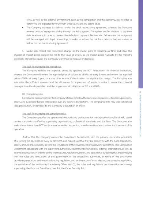 3. Market risk: market risks come from changes of the market price of collaterals of NPLs and NPAs. The