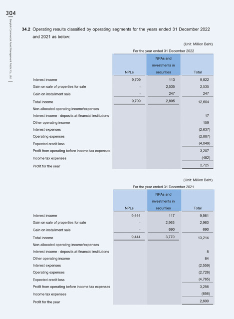 34.2 Operating results classified by operating segments for the years ended 31 December 2022