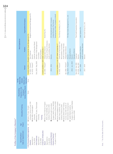 Vice Chairman Current position in Bangkok Commercial Asset Management Plc. Director Chairman of Executive Board Member of Risk Management Committee Acting President Current position in SET-listed companies: 1 Independent Director Chairman of Board of Directors Audit Committee Member Director Current position in non SET-listed companies: 2 Chairman of Nomination and Remuneration Committee Audit Committee Me