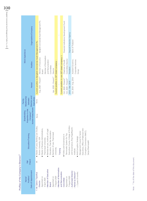 Profiles of the Company’s Directors /1 Name/ Age Position/ (Years) Date of Appointment 64 7. Mr. Satorn Topothai - Director Appointed on 3 April 2020 - Member of Executive Board Appointed on 7 August 2020 - Member of Nomination and Remuneration Committee Appointed on 7 August 2020 - Authorized Director - Period as Director /1 : 2 years 8 months Note /1 As of the date of this docum