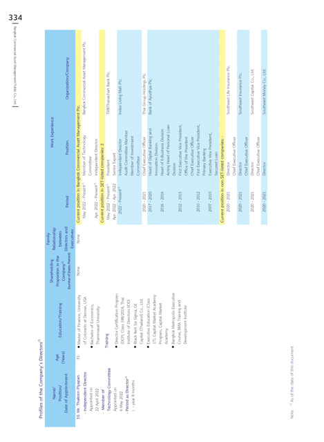 Profiles of the Company’s Directors /1 Name/ Age Position/ (Years) Date of Appointment 51 10. Mr. Thakorn Piyapan - Independent Director Appointed on 22 April 2022 - Member of Technology Committee Appointed on 6 May 2022 - Period as Director /1 : - year 8 months
