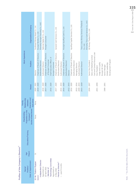 Profiles of the Company’s Directors /1 Name/ Age Position/ (Years) Date of Appointment 51 10. Mr. Thakorn Piyapan (cont.) - Independent Director Appointed on 22 April 2022 - Member of Technology Committee Appointed on 6 May 2022 - Period as Director /1 : - year 8 months Note /1 As of the date of this document.