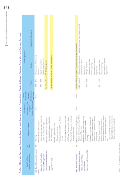 Name/Position/ Date of Appointment 6. Mr. Chanwit Kaveesoonthornsanoh (cont.) - Executive Vice President Financial Management, Accounting and Investment Group Appointed in 2021 7. Mrs. Wannee Punkawong - Director of Accounting and Chief Financial Officer (accountant) Appointed on 1 October 2018 Note /1 As of the date of this document.