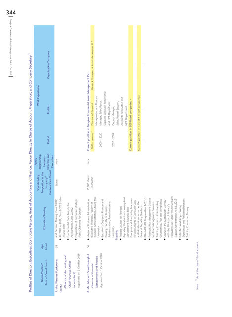 Name/Position/ Date of Appointment 7. Mrs. Wannee Punkawong (cont.) - Director of Accounting and Chief Financial Officer (accountant) Appointed on 1 October 2018 8. Ms. Jatuporn Suwattanangkul - Director of Financial Management and Finance Appointed on 1 October 2020 Note /1 As of the date of this document.