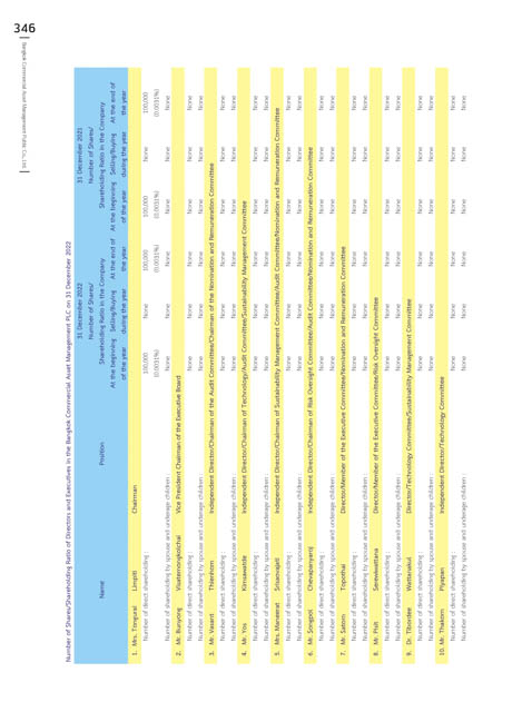 31 December 2022 Number of Shares/ Shareholding Ratio in the Company At the end of Selling/Buying At the beginning the year during the year of the year 100,000 None 100,000 (0.0031%) (0.0031%) None None None None None None None None None Independent Director/Chairman of the Audit Committee/Chairman of the Nomination and Remuneration Committee None None None None None None Independent Director/C