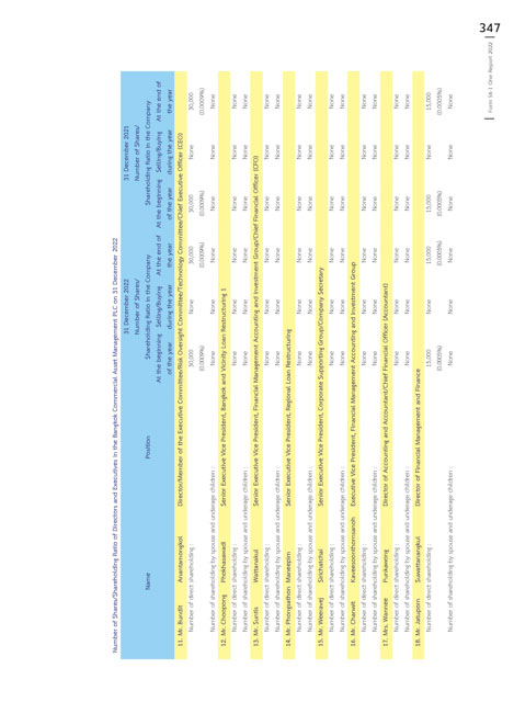 31 December 2022 Number of Shares/ Shareholding Ratio in the Company At the end of Selling/Buying At the beginning the year during the year of the year Director/Member of the Executive Committee/Risk Oversight Committee/Technology Committee/Chief Executive Officer (CEO) 30,000 None 30,000 (0.0009%) (0.0009%) None None None None None None None None None Senior Executive Vice President, Financial