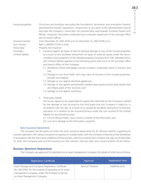 31, 2022, the Company took out the insurance for 332 vehicles, with the total sum insured of Baht 155.25 million.