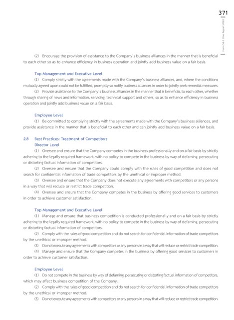 (3) Do not execute any agreements with competitors or any persons in a way that will reduce or restrict trade competition.