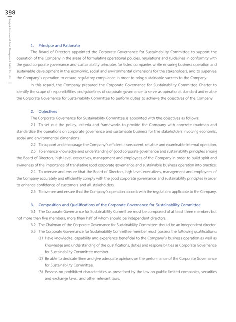 The Corporate Governance for Sustainability Committee is appointed with the objectives as follows:
