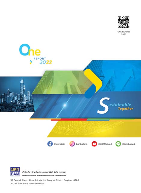 ONE REPORT 2022 R E P O R T 2022 ustainable Together @onlineBAM bamthailand @BAMThailand @bamthailand 99 Surasak Road, Silom Sub-district, Bangrak District, Bangkok 10500 Tel. 02 267 1900 www.bam.co.th